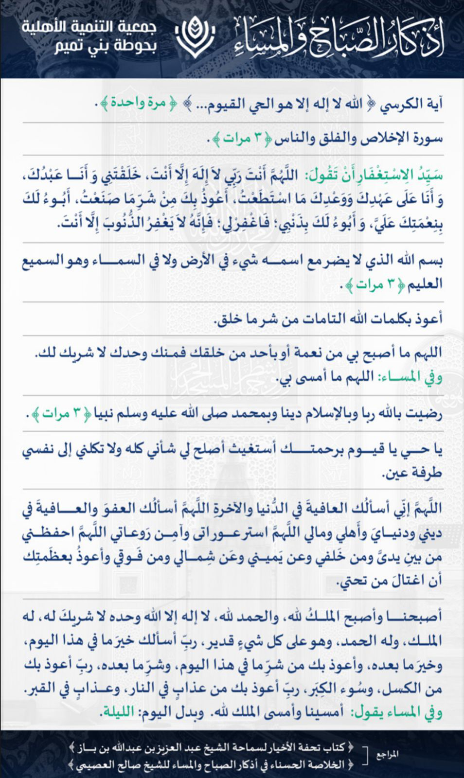 جاء في الحديث عن أُبي بن كعب أن الجِّنَّي قال له: “إذا قرأتها -يعني آية الكُرسي- غدوةً أُجِرْتَ منا حتى تمسي، وإذا قرأتها حين تمسي أُجِرْتَ منا حتى تصبح”.